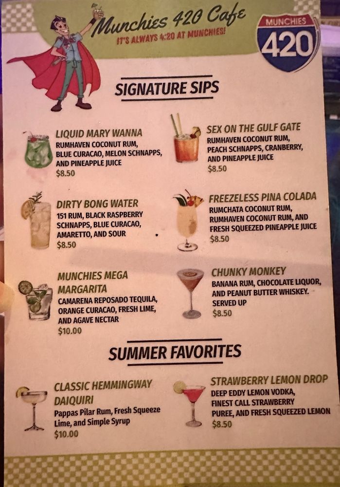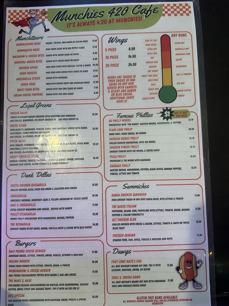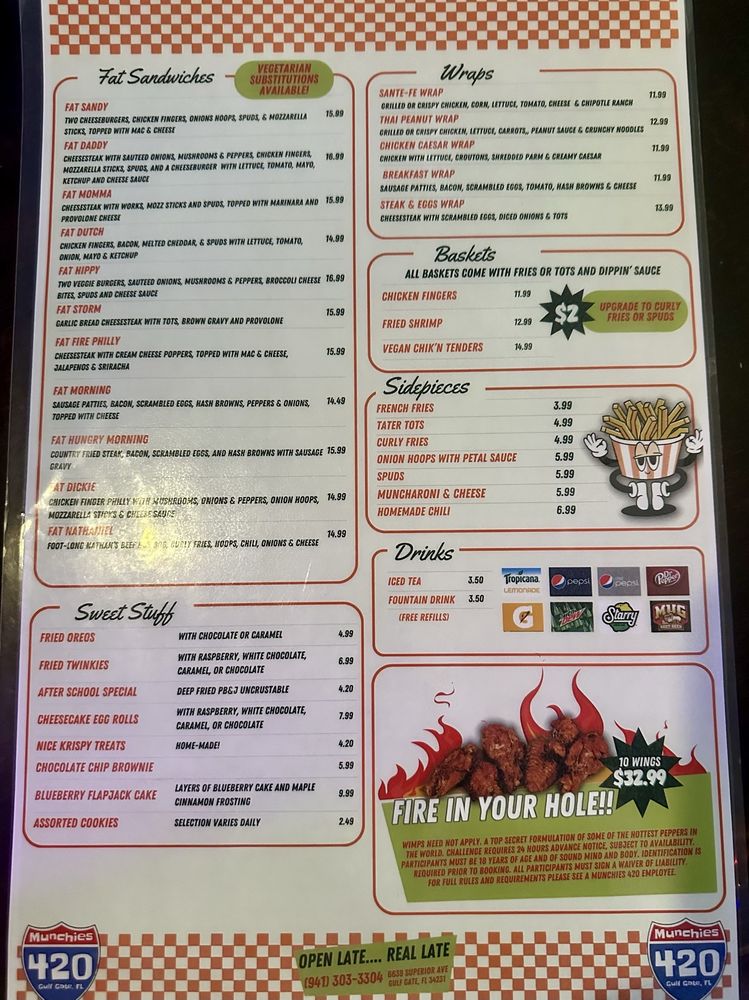 Introducing the menu at Munchies 420 Cafe, located in Sarasota, FL, this unique eatery offers a variety of delicious options such as cheesesteaks, wraps, and sandwiches. With a range of vegetarian options, this cafe caters to all dietary preferences. The establishment provides delivery, takeout, and even offers catering services, making it a convenient choice for any occasion. The ambiance is described as divey with moderate noise levels, perfect for group gatherings or late-night meals. Additionally, Munchies 420 Cafe boasts amenities like outdoor seating, a full bar, free Wi-Fi, and even happy hour specials. With waiter service and options for both indoor and outdoor dining, this cafe is suitable for families, friends, and even pet owners. Overall, Munchies 420 Cafe offers a unique dining experience with a diverse menu and a welcoming atmosphere.